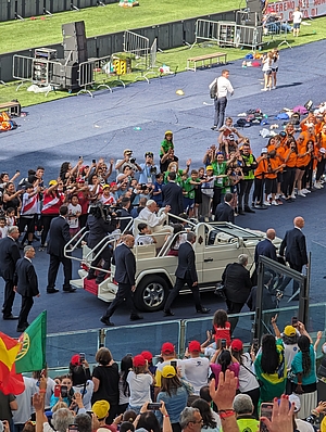 Mit einem Unterhaltungsprogramm, gestaltet von Kindern aus der ganzen Welt, begann im Olympiastadion der Weltkindertag. Kinder aus über 60 Ländern von allen Kontinenten zogen mit einer großen Flaggenparade, wie bei den olympischen Spielen, in das Stadion ein. Wir machten Laola-Wellen und sangen mit, bis dann am Nachmittag der Heilige Vater selbst kam. Bestens gelaunt und ziemlich fit umrundete er das Stadion und hörte sich anschließend Fragen vieler Kinder an. In ihren eigenen Worten formulieren Kinder aus allen Erdteilen, was sie bewegt.