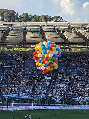 Am Samstag den 25. Mai ging es früh los: Nach einem Tag Erkundung antiker Stätten, der ersten Pizza und dem ersten Eis wurden wir abgeholt und zum olympischen Dorf am Olympiastadion in Rom gebracht. Schon im Bus konnte man ein Gefühl dafür bekommen, dass wir heute und morgen viele Kinder aus der ganzen Welt treffen werden. Insgesamt wurden 100.000 Besucher erwartet. Bevor es am Mittag in das Olympiastadion ging, haben wir die vielen Spiele und Aktivitäten erkundet, die im olympischen Dorf aufgebaut waren. Wir haben mit Christen aus Guatemala Spielzeug gebastelt, der italienischen Feuerwehr bei einer Rettungsübung zugesehen und die Weitsprunggrube neben dem Olympiastadion in den größten Sandkasten Roms verwandelt.