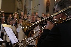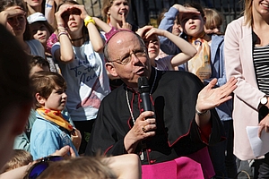 Nach der Einladung durch Bischof Ulrich Neymeyr zur feierlichen Abschlussmesse in den Dom stiegen die Chöre singend die Stufen hinauf, den Kanon "Kommt, wir ziehen hinauf zum Berg des Herrn" auf ihren Lippen. In seiner Predigt ermutigte der Bischof die jungen Sängerinnen und Sänger, durch die Harmonie ihres Gesangs ein Vorbild für die Einheit in ihren Gemeinden und in der Kirche, ja für die Menschheitsfamilie zu sein. Der Kinder- und Jugendchor am Erfurter Dom unter Leitung von Elisabeth Lehmann-Dronke, die in Erfurt den Tag mit der Unterstützung vieler Helfer organisiert hatte, bildete den Favoritchor, der viele Stücke an- und vorsang.