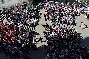Nach der Mittagspause, während der bei strahlendstem Wetter interessante Orte in der Erfurter Altstadt erkundet werden konnten, trafen sich alle auf den Domstufen wieder. Mit einigen Liedern ließen die Chöre die Menschen auf dem Domplatz an ihrer Freude am gemeinsamen Singen teilhaben. Seit den letzten Jahren des Zweiten Weltkrieges, als die Idee der Pueri Cantores in Frankreich entstanden war, ist es ihr Anliegen, durch den gemeinsamen Gesang für Versöhnung und Einheit zu wirken und die Botschaft von Gottes Frieden für alle Menschen zu verkünden. Viele Erfurter blieben vor dem Domberg stehen und ließen sich von den frohen Kinderstimmen anrühren und begeistern.