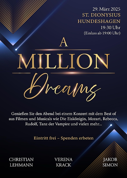 Nach der erfolgreichen Premiere im Frühjahr 2024 in Uder freuen sich Verena Krack, Christian Lehmann und Jakob Simon, unter dem Namen „Musical Moments“, dass ihr Musicalkonzert „A Million Dreams“ am Samstag, 29. März 2025, um 19:30 Uhr in der St. Dionysius-Kirche (Kirchenweg 4) ins Musikantendorf Hundeshagen zurückkehren wird.