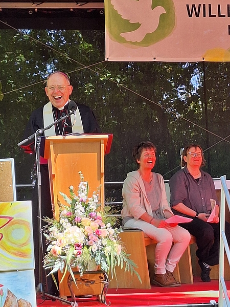 Generalvikar Dominik Trost (li), der seit einem guten halben Jahr im Amt ist, war das erste Mal auf einer Frauenwallwallfahrt und stellte sich in einer Zwischenveranstaltung den vielfältigen Fragen der Wallfahrenden