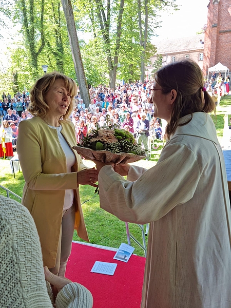 Dem langjährigen Ordner (mit vielen anderen seit Jahrzehnten der "gute Geist") und der Leiterin des Familienzentrums Kloster Kerbscher Berg, Pia Schröter, wurde mit herzlichen Worten, großem Applaus und einem Blumenstrauß gedankt - Fotos: Martin Hoffmeier