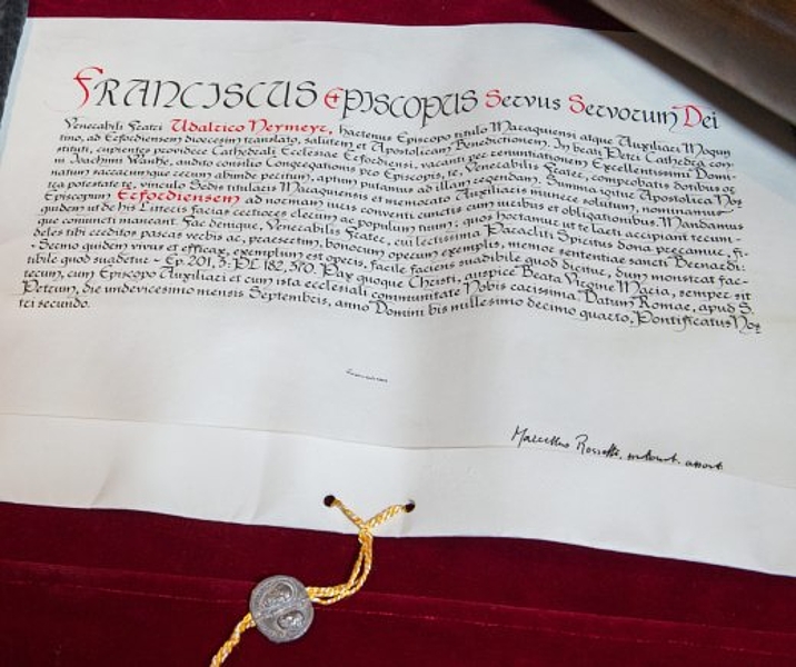 Bischof Franziskus, Diener der Diener Gottes, dem ehrwürdigen Bruder Ulrich Neymeyr, bisher Titularbischof von Maraguia und Mainzer Weihbischof, der zur Diözese Erfurt versetzt ist, Gruß und apostolischen Segen!