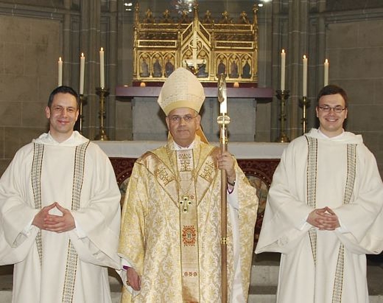 Weihbischof Reinhard Hauke mit den beiden zum Diakon geweihten Dominikanern Frater Johannes M. Schäffler und Frater Gregor Naumann (li.)