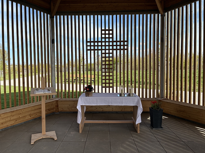 Vom Haupteingang aus ist der Bonifatiusplatz als erster Halt auf dem Rundweg leicht erreichbar. Eine große Holzfigur erinnert an den Heiligen Bonifatius, der die Donar-Eiche gefällt hat, und lädt zwischen Bänken und Pflanzen zum Verweilen ein. Der Pavillon selbst ist halb-offen, mit festen und mobilen Sitzplätzen, Altar sowie flexibler Bestuhlung auf dem Vorplatz. Die Lamellen lassen sich manuell öffnen und schließen – so passt sich der Ort den Bedürfnissen der Besucher:innen an.