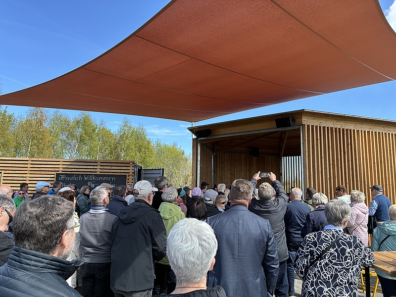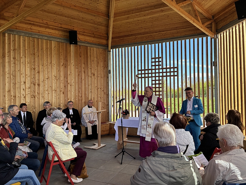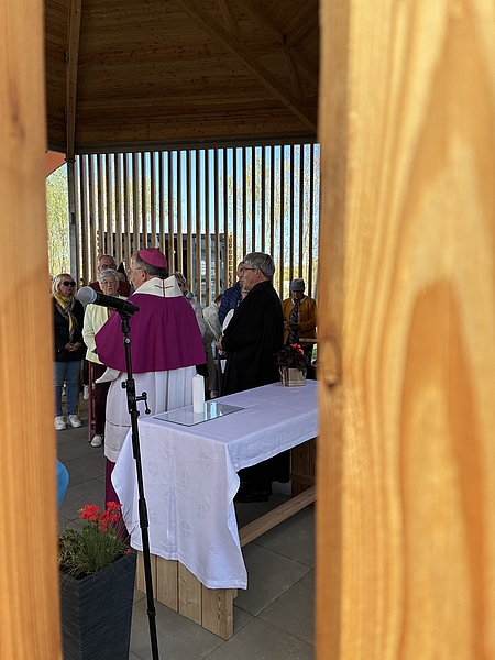 Besonders an diesem Tag war die Segnung des Kirchenpavillon auf der „Landmarke“ – dem höchsten Punkt im Auegarten – und der 50 ehrenamtlichen Gästebegleiter:innen, die in den kommenden Monaten das Gesicht des Kirchenstandorts prägen werden. Hier können Besucher:innen während der Gartenschau Ruhe finden, ins Gespräch kommen oder einfach den Blick über die Anlage genießen. Gebete für Frieden und Einheit sowie der Friedensgruß mit dem Lied „Da berühren sich Himmel und Erde“ spiegelten das Motto des Tages und der Gartenschau wider. In Predigt und Gottesdienst wurde zudem das Bild von Gott als Gärtner aufgegriffen, als einer, der Freude hat am Leben, an Vielfalt und am Duft des Lebendigen. Zugleich wurde betont, dass niemand für sich allein steht. Niemand ist die einzige Rebe am Weinstock, vielmehr sind Menschen als Gemeinschaft der Christ:innen und im Miteinander gemeinsam unterwegs.