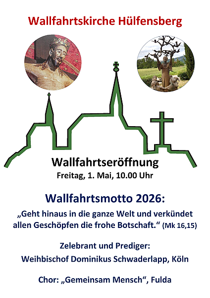 Die Franziskanerbrüder vom Hülfensberg eröffnen die diesjährige Wallfahrtssaison mit einer festlichen Eucharistiefeier am Freitag, 1. Mai, um 10.00 Uhr. Als Zelebrant und Festprediger konnte Weihbischof Dominikus Schwaderlapp aus Köln gewonnen werden. Für die musikalische Gestaltung sorgt der Chor „Gemeinsam Mensch" aus Fulda, der zum Netzwerk antonius gehört – einer Initiative für Menschen mit Behinderung.