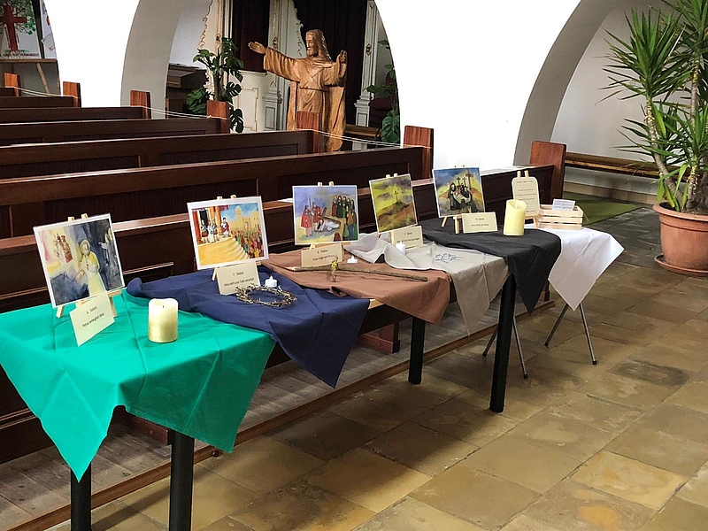 Familien können in der Karwoche diesen Kreuzweg eigenständig beten und kindgerecht betrachten - "Kreuzweg to go" sozusagen. Für die Kinder liegen auch Hefte mit passenden Gebetstexten aus und ebenso Teelichter zum Mitnehmen nach Hause.