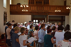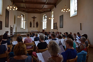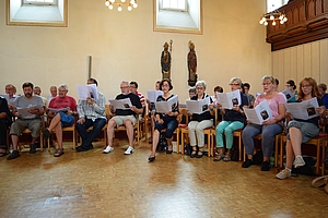 Es ist Bistumschortag in der Brunnenkirche am Fischersand in Erfurt, und der Einladung des Seelsorgeamts des Bistums Erfurt sind weit über 80 Sängerinnen und Sänger aus Erfurt, Eisenach, Jena, Ilmenau, Mühlhausen, Heiligenstadt, ja aus ganz Thüringen und sogar Sachsen-Anhalt gerne zum Bistumschortag (18.8.) gefolgt. In diesem Jahr war er unter dem Motto „MehrKlang“ auf Jugendliche und Erwachsene ausgerichtet. Es wird fleißig gesungen, intensiv geprobt und am Chorklang gefeilt. Schließlich will der Chor als Bistumsprojektchor bestens vorbereitet die große Bistumswallfahrt auf dem Domplatz in Erfurt im September festlich mitgestalten.