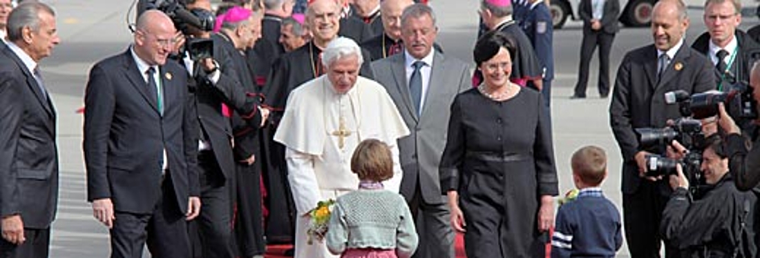 Erfurt. Um 10.55 Uhr landete das Flugzeug mit dem Heiligen Vater heute am Flughafen Erfurt. Um 11.05 Uhr entstieg Papst Benedikt XVI. lächelnd der Bundeswehrmaschine. Auf dem Rollfeld hießen ihn bei strahlendem Sonnenschein Thüringens Ministerpräsidentin Christiane Lieberknecht und Bischof Joachim Wanke willkommen.