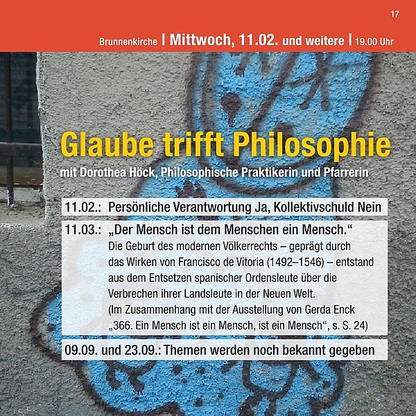 Weitere Gesprächsabendeder Reihe “Glaube trifft Philosophie” finden am 11. März statt (Thema “Der Mensch ist dem Menschen ein Mensch”), sowie am 9. und 23. September (Themen werden noch bekannt gegeben).