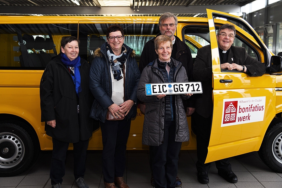 Eines der rapsgelben VW-Busse ist an die Gemeinde St. Matthäus in Arenshausen gegangen. Das Kfz-Kennzeichen EIC-GG 712 ist bewusst gewählt als Hinweis auf die Situation der Kirche im Bistum Erfurt: Großgemeinde seit Juli 2012.