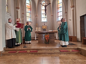 Die Gemeinde erinnerte der Bischof daran, dass gerade beim Wechsel einer Leitung deutlich wird, „dass der Herr der Kirchengemeinde derselbe bleibt, unser Herr Jesus Christus. Jede Pfarrei und jeder Kirchort muss sich darum bemühen, wach zu bleiben für die Gegenwart Jesu Christi und dafür, wohin er seine Kirche führen möchte. Wenn die Verhältnisse sich ändern, wenn es nicht mehr die Möglichkeiten gibt, die es früher gab, wenn sich neue Herausforderungen stellen, so muss dies auch im Lichte dessen gesehen werden, dass der Herr Jesus Christus seine Kirche leitet. Es hilft dann nicht, immer zurückzuschauen und von früheren Zeiten zu schwärmen. Man kann ein Auto nicht fahren, wenn man nur in den Rückspiegel schaut.“