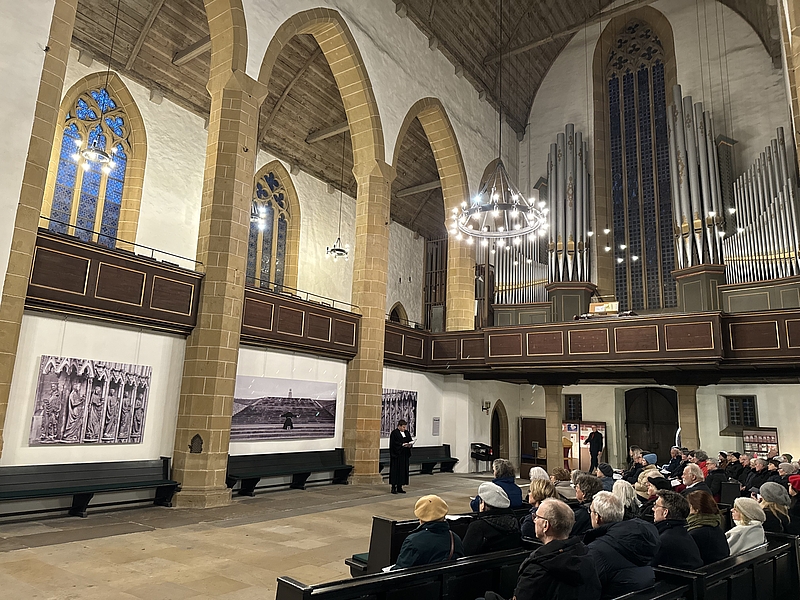 Die Erinnerung an das Furchtbare wach halten – und gleichzeitig ein Zeichen der Versöhnung setzen: Am Sonntag, 26. Januar 2025 luden die Jüdische Landesgemeinde Thüringen, das Katholische Dekanat Erfurt und der Evangelische Kirchenkreis Erfurt gemeinsam zum ökumenischen Gottesdienst zum Holocaust-Gedenken im Evangelischen Augustinerkloster zu Erfurt ein. Der VoicESS-Kammerchor begleitete die Andacht musikalisch mit Liedern und Gesängen.